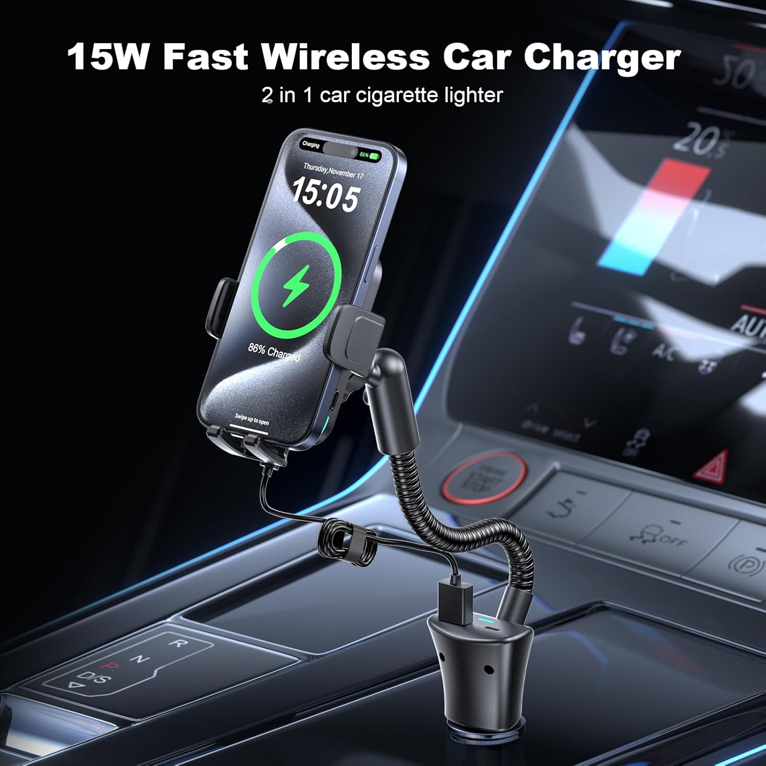 Carregador Sem Fio para Carro 15W com Suporte para Isqueiro e Carregamento Rápido Dual Port PD