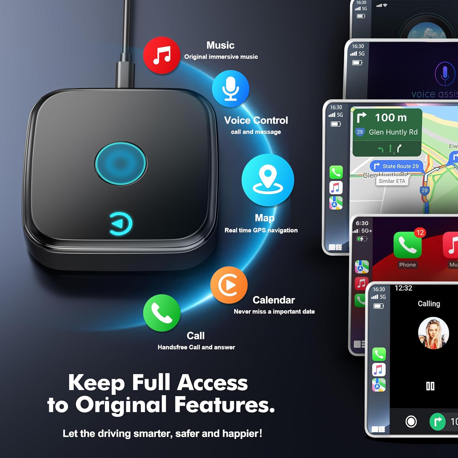 O dongle wireless CarPlay garante que todos os controles originais do seu carro permaneçam intactos. Seja seu telefone no bolso ou na mochila, o adaptador suporta comandos de voz, pressionamento de botões, interações na tela sensível ao toque e operações de botão giratório. Isso permite que você mantenha uma experiência de condução intuitiva e contínua, exatamente como foi originalmente projetada.