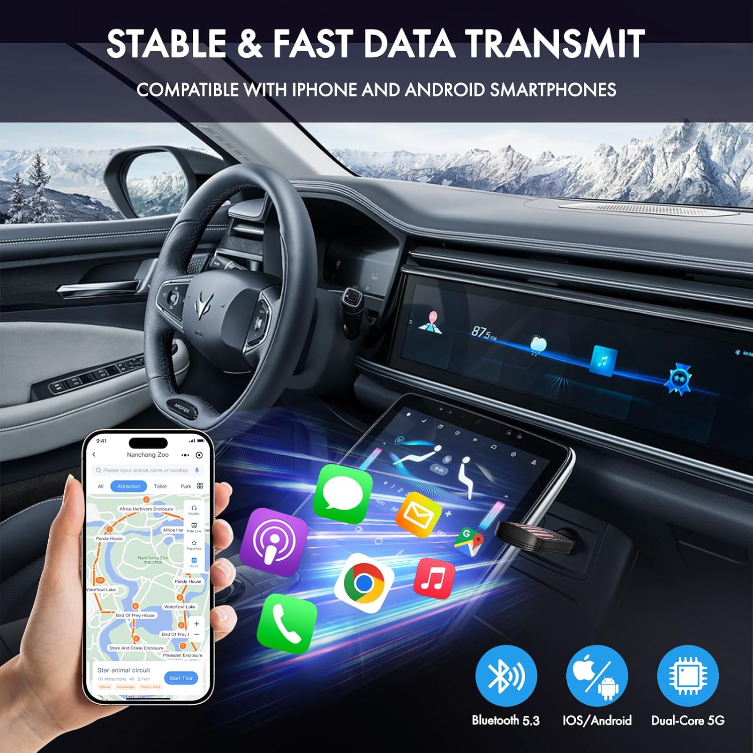 Experimente o emparelhamento instantâneo e uma conexão sólida toda vez que você ligar o carro. O adaptador foi projetado para oferecer streaming suave, chamadas claras e navegação confiável. Esteja você em um trajeto rápido ou em uma longa viagem, mantenha-se conectado sem esforço.