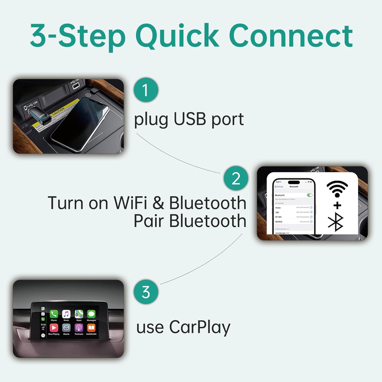 I bought this because my car has a wired CarPlay and thought it would be nice so I wouldn’t have to plug my phone in anymore. Well, the instructions for it hardly make sense so you have to guess at the steps to pair it, then it only worked once for maybe half a day and it won’t connect to my phone anymore. All it says it pair with Bluetooth which I have done several times and it won’t connect. Oh, yeah and don’t leave it plugged in even though the advertisement says it turns off, it doesn’t and will drain your battery. Don’t waste your money buying this crappy product and just stick with the extra 5 second of plugging your phone in. Atleast with your phone plugged in it charges and you get CarPlay.