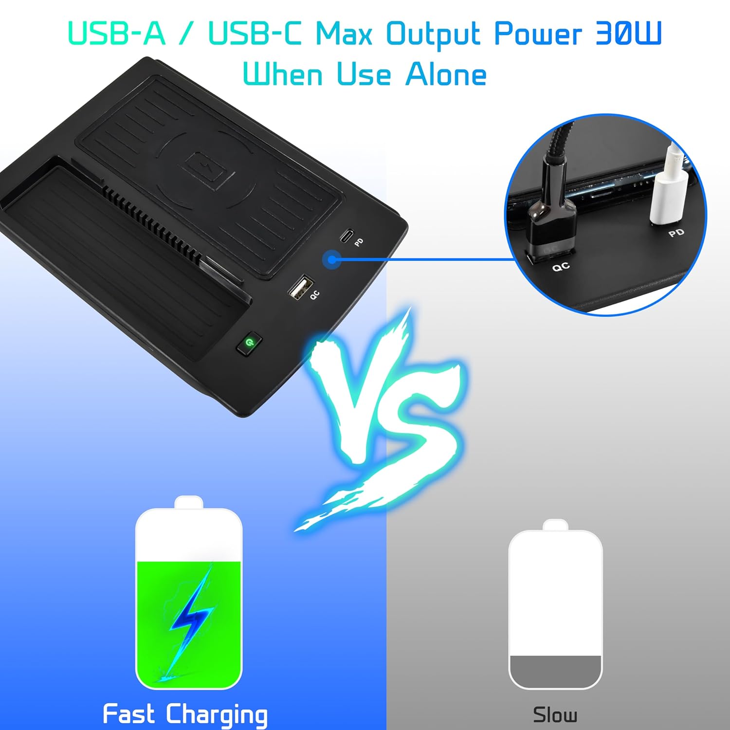 – Painel Amplo: Suporta smartphones com USB-A, USB-C e carregamento sem fio.