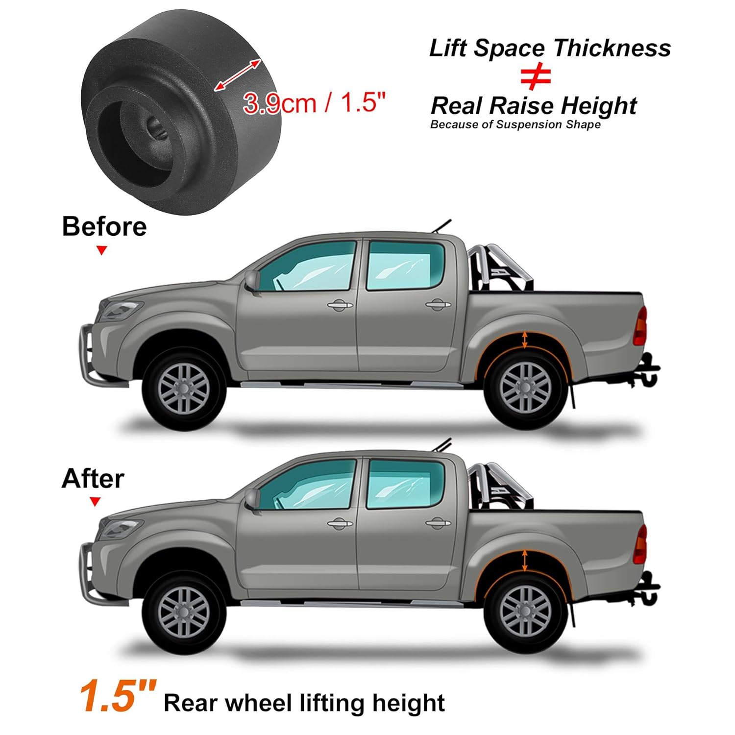 O X AUTOHAUX 1.5inch Rear Suspension Spring Strut Spacer Leveling Lift Kit é a solução ideal para proprietários de Dodge Ram 1500 dos anos de 2011 a 2018, tanto para versões 2WD quanto 4WD. Este kit de nivelamento foi projetado para elevar a traseira do seu veículo, proporcionando um equilíbrio perfeito na altura da carroceria e permitindo a instalação de pneus maiores. Se você planeja aventurar-se em trilhas off-road ou utilizar um plow de neve ou reboque, este kit é essencial para otimizar a performance do seu pickup.