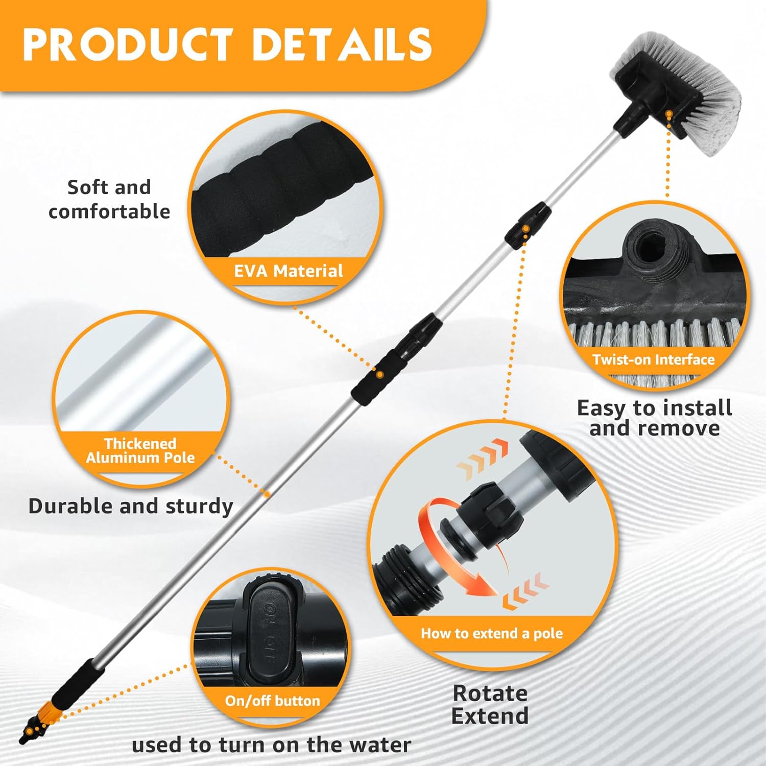 – Cano Telescópico para Lavagem: O cabo longo da escova é feito de alumínio de alta qualidade, que é robusto e leve. Com a capacidade de extensão de 5 a 12 pés, você pode evitar o uso de escadas, mantendo-se seguro no chão. Essa versatilidade economiza tempo e energia em áreas de difícil alcance.