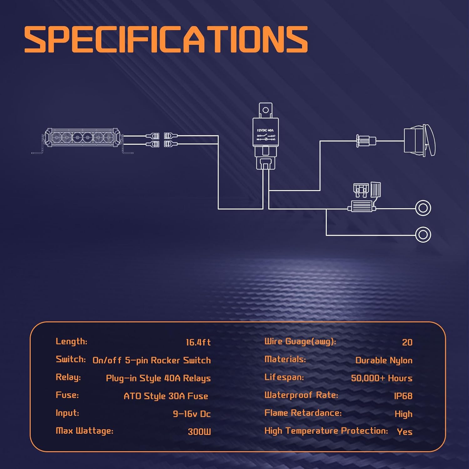 - Configuração Conveniente: Com um comprimento total de cabo de 16,4 pés, interruptor rocker on/off, relé de 40A, fusíveis e conectores, a instalação é simples e rápida, permitindo que você aproveite suas luzes em pouco tempo.