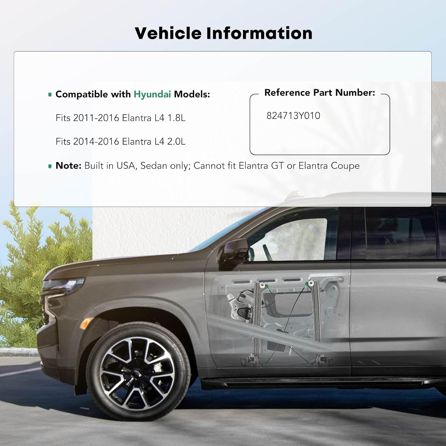 - Ajuste Perfeito: Nosso regulador de janela e montagem do motor são projetados para serem compatíveis com o Hyundai Elantra 2011-2016 L4 1.8L Sedan, adequado para Elantra 2014-2016 L4 2.0L Sedan. Este produto é compatível apenas com modelos fabricados nos EUA, não se aplicando ao Elantra GT ou Elantra Coupe.