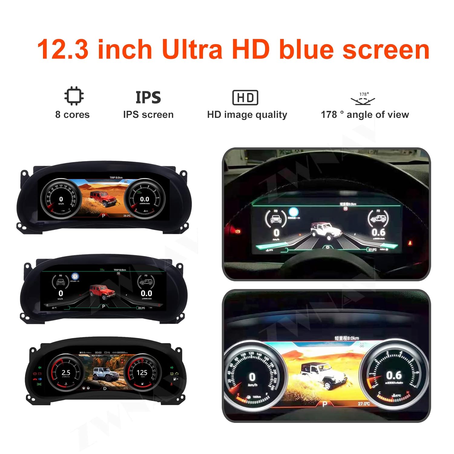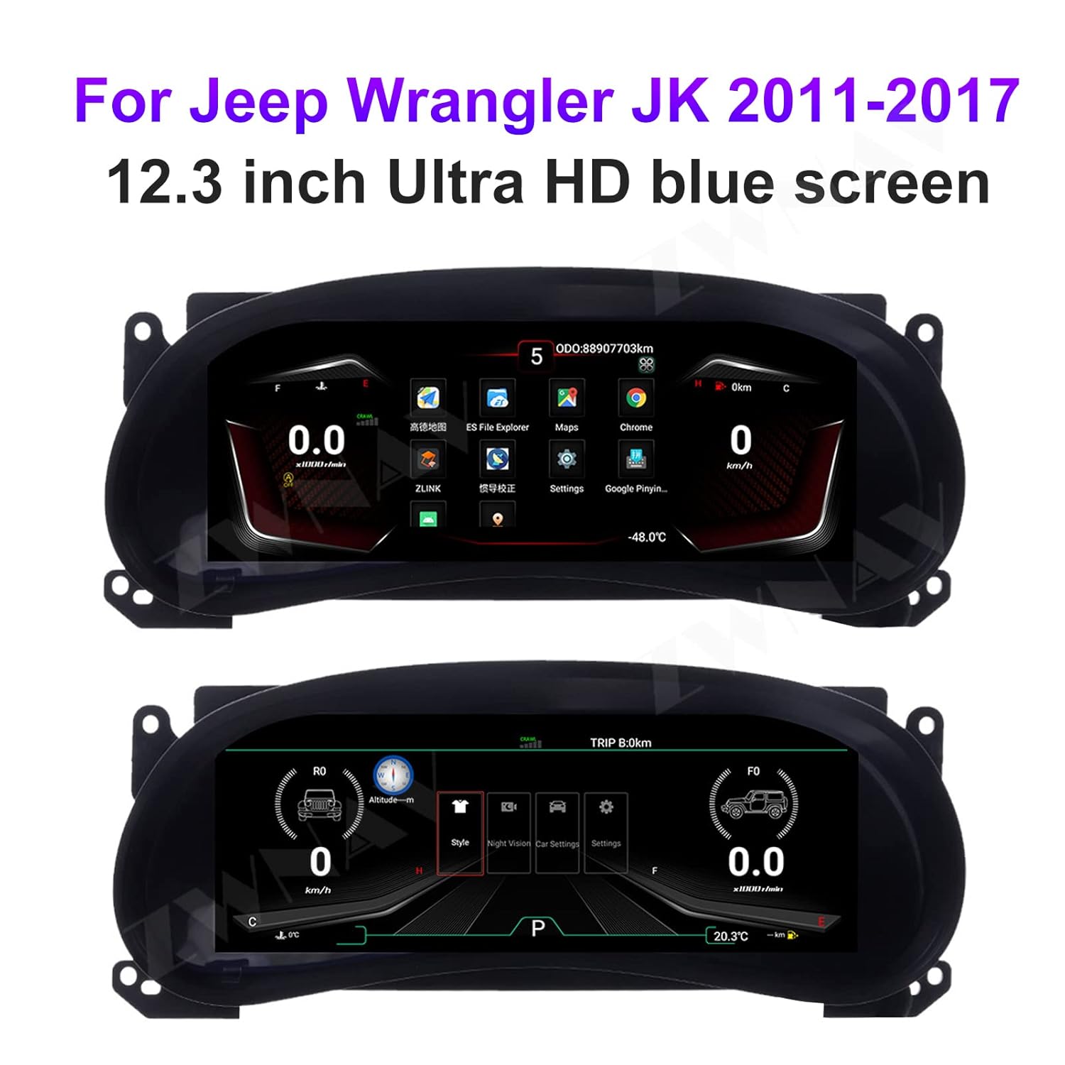 O Velocímetro Digital ZWNAV é a solução perfeita para os proprietários de Jeep Wrangler JK entre os anos de 2011 e 2017 que buscam modernizar o painel de instrumentos do seu veículo. Com um design inovador e tecnologia de ponta, este painel de instrumentos digital oferece uma experiência de condução superior, combinando funcionalidade e estética em um único produto. O display IPS LCD proporciona uma visualização clara e nítida, mesmo sob luz solar intensa, garantindo que você tenha todas as informações necessárias à sua disposição, a qualquer momento.