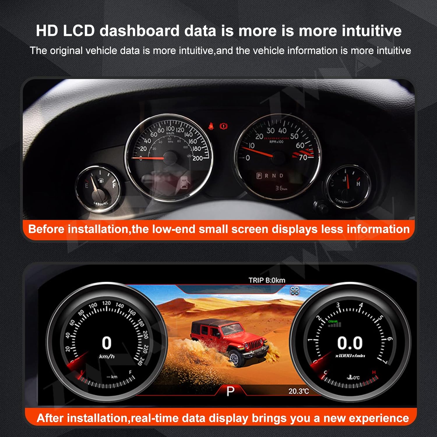 O Velocímetro Digital ZWNAV é a solução perfeita para os proprietários de Jeep Wrangler JK entre os anos de 2011 e 2017 que buscam modernizar o painel de instrumentos do seu veículo. Com um design inovador e tecnologia de ponta, este painel de instrumentos digital oferece uma experiência de condução superior, combinando funcionalidade e estética em um único produto. O display IPS LCD proporciona uma visualização clara e nítida, mesmo sob luz solar intensa, garantindo que você tenha todas as informações necessárias à sua disposição, a qualquer momento.